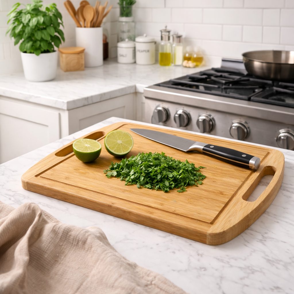 - Protect your knives and countertops with our bamboo cutting board, made of renewable environmentally friendly bamboo